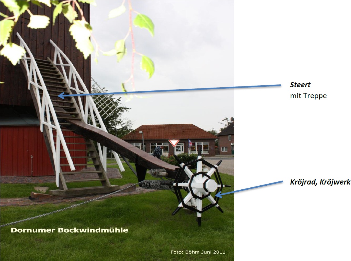 an dessen Ende sich eine Handwinde (Kröjrad) befindet, um die Mühle in den Wind zu drehen.